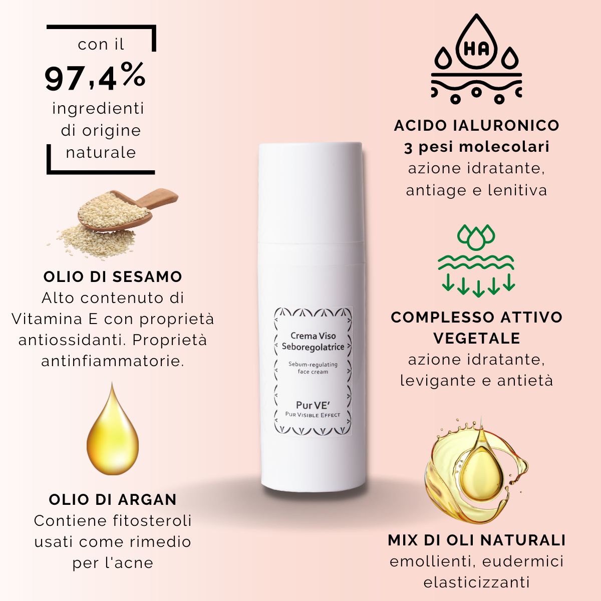 L’attivo principale, usato nelle formulazioni per pelli grasse con aspetto acneico, è un complesso di fitosteroli e lignani che combatte in modo efficace la produzione di sebo in eccesso grazie alla tripla azione di un elisir oleoso composto da tre oli vegetali. L’olio di sesamo ha un alto contenuto di vitamina E con proprietà antiossidanti e antiinfiammatorie. Gli ingredienti attivi sono in grado di ringiovanire la barriera cutanea e aiutare a mantenere la pelle del viso idratata.
